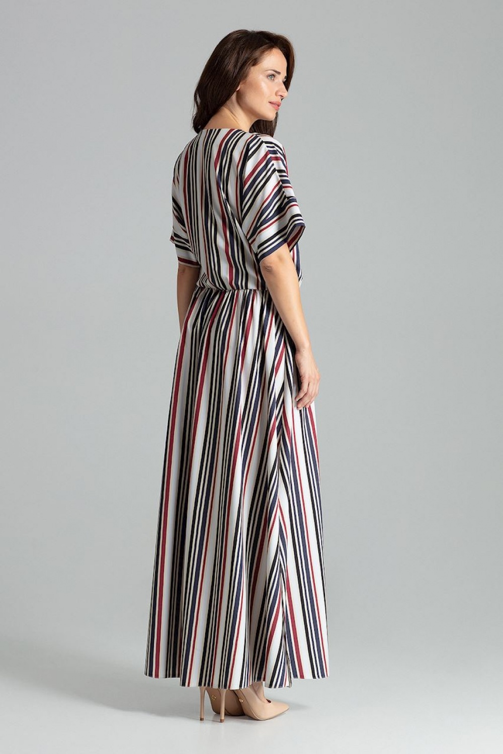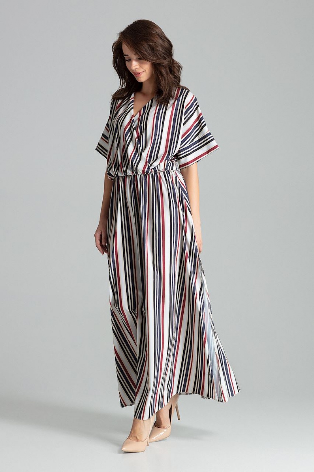 Long striped dress with short kimono sleeves ending in a cuff. Long skirt is cut off at the waist, slightly flared with side slits. Waist with sewn in elastic band. Envelope neckline.