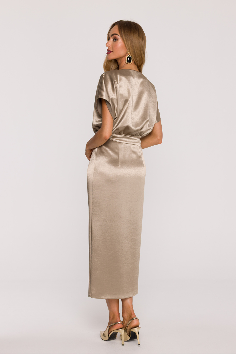 Subtle and elegant midi dress made of satin, which delights with the simplicity of form and the noble shine of the fabric. Made of smooth, dense satin, it softly envelops the silhouette and beautifully reflects the light, creating a luxurious lightness effect. The model has a boat neckline, which delicately exposes the line of the shoulders and neck, and the short, loose sleeves add a sense of airiness and comfort. The top of the dress has a looser fit, allowing it to be subtly tucked into the skirt, creating a free, natural line. The bottom, tied like a pareo around the waist, allows for adjusting the fit to the silhouette and emphasizing the waist in a stylish, feminine way. The dress has no lining, which makes it light, pleasant to the touch, and perfect for warmer days. The model was designed and made in Poland with the utmost attention to detail. It is an elegant satin midi dress that combines comfort, minimalism, and feminine charm, perfect for parties, meetings, and summer occasions when you want to look chic with natural lightness.